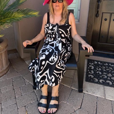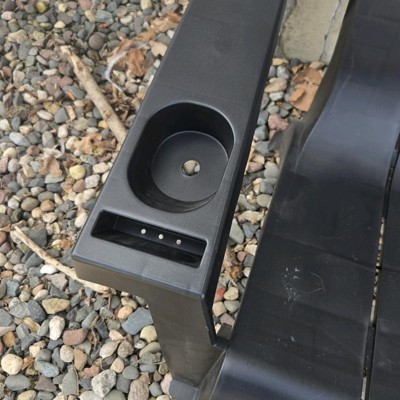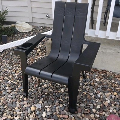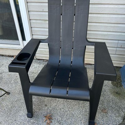 This is a super black colored Adirondack chair for outdoors that can be styled with a fun cushion. It would look great on the deck or by the pool. It has a handy drink holder that also works for keys. We bought one but it would look great in pairs or a set of three around a coffee table. The arm rests are wide and a great shape.