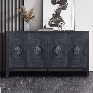 Featuring classic large floral-patterned door handles and intricate detailing, this cabinet exudes timeless elegance and adds a sophisticated touch to your home decor. Expertly crafted from high-quality board with a pine veneer, the cabinet showcases rich texture and depth achieved through a burn-through finishing process, enhancing its visual appeal. The flexible interior design includes a center panel with three adjustable height levels, allowing you to easily customize the shelving and organization to suit a variety of storage needs and item sizes. Every unit is thoroughly inspected before shipment to ensure superior quality and completeness, delivering both beauty and reliability for your living space.