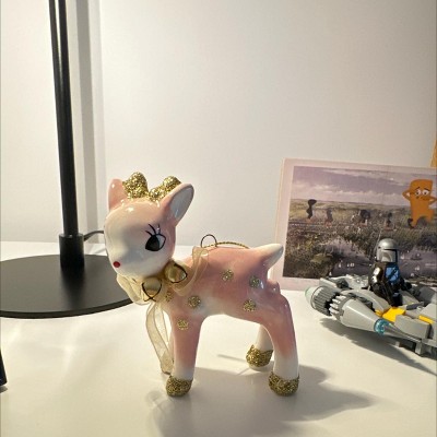 This 1950's retro my deer ornament is adorable! It's so cute as a tchotchke figurine, you could leave it out all year long. The ombre pink paint is imperfectly perfect, while the eyes are perfect. I would buy in store, to choose best one for you. Happiness.☺️