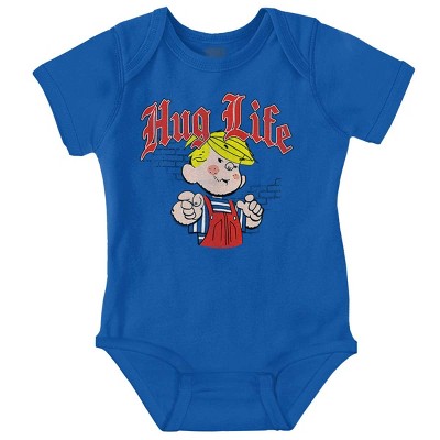 Retro Dennis The Menace Whatever Baby Romper Boys or Girls Licensed Brisco Brands Royal 12m