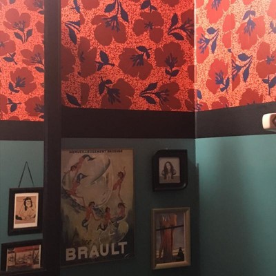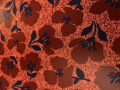 A: Hi MB - Great question! The repeating pattern on this lovely Retro Wallpaper is dark red flowers with black stems and leaves. Make any flat surface in your home pop with a burst of color. - Mark