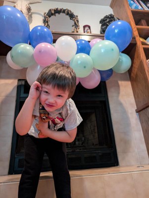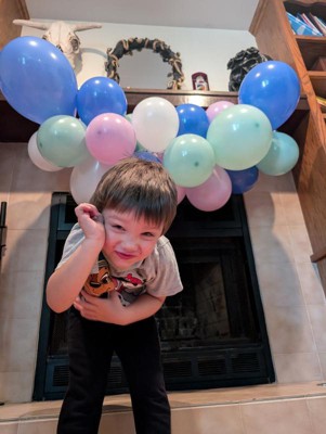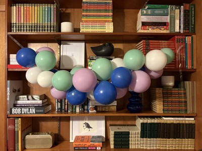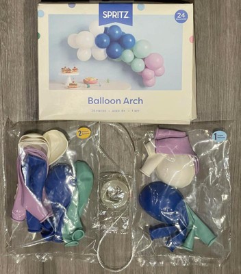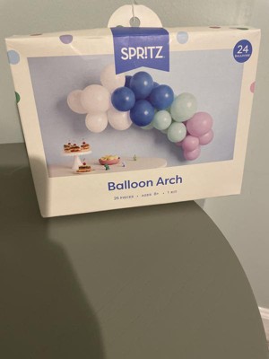 The Spritz balloon arch comes with everything you need including balloons, arch form and fishing line for hanging. The color palette is soft and pretty and would be perfect for a birthday or shower. It is super simple to assemble. What takes the longest is inflating all the balloons.
