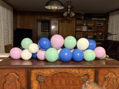 I got the 24-Count Multicolor Balloon Arch Garland for a party. This was the first balloon garland I had ever made, and I found it both fun and easy to assemble. The kit includes 8 large balloons, 16 medium balloons, fishing line, and other necessary items for assembly. The colors in the garland are white, blue, green, and pink.