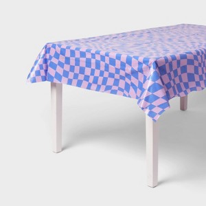 A: The table cover features a classic checkered design in vibrant blue and pink colors.