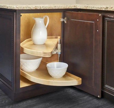 This 2-tiered lazy susan is a great fit for blind corner kitchen cabinets thanks to its half-moon shape that pivots out of your cabinet to display your items. Each lazy susan shelf can hold up to 20 pounds per square foot. This wooden lazy susan comes with 2 wooden shelves, pivot, and slide hardware.
