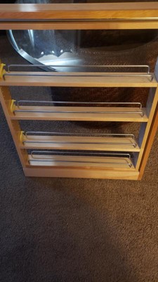 [This review was collected as part of a promotion.] I am totally in love with this rack. It is solid, made with great materials and can fit all kinds of spice containers. Handy little rails keep our spices in place, everything is easy to find and get to. The wood this rack is made of is simply lovely; it has warm honey tone and is a pleasure to touch. One important thing to remember is not to remove the piece of material holding the sliding part in place until the rack is installed. I was so excited when we got it, that I wanted to try it slide. Good thing the brace is clearly marked and I stopped myself in time. The shelves are wide enough for larger container sizes. I love to cook and love even more to feed people. We use lots of different spices, some bought, some dried and prepared at home. This contraption can hold all of my cooking stash and then some. Simply terrific!