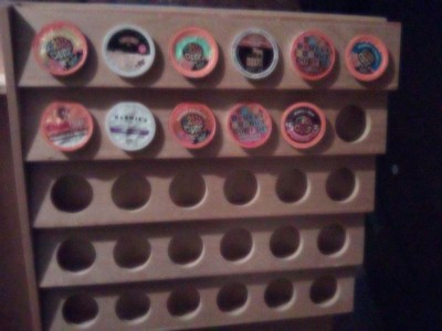 [This review was collected as part of a promotion.] I really like this nifty little k-cup holder! It's very sturdy/heavy duty and it holds a decent amount of k-cups! I love the fact that the k-cups are at a bit of an angle, making it a bit easier for you to see the tops of the cups. I do wish the 'slab' in the back was a little shorter, but this could easily be fixed with the proper tools! As mentioned earlier, it is rather heavy duty, the wood feels very sturdy! I did lay my insert landscape like, this made it easier for me to see while im at the coffee pot. All in all, we are pleased!