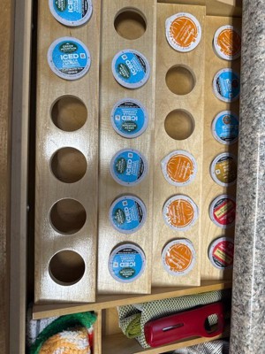 [This review was collected as part of a promotion.] MAXIMIZE DRAWER SPACE: Drawer tray helps transform coffee or tea situations into an organized, clean, and accessible beverage station • DURABLE CONSTRUCTION: Durable, solid wood construction with a clear finish and 5 tiers can hold up to 30 pods at once • DESIGNED FOR: Designed for an easy and drop-in installation with a minimum cabinet opening height of 4.5 inches; Can be trimmed to fit an existing drawer