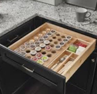 [This review was collected as part of a promotion.] The Rev-A-Shelf 4CDI-18-KCUP-1 16 Inch K-Cup Solid Wood Custom Kitchen Drawer Insert is a game-changer for coffee lovers. Crafted from solid wood, it offers both durability and a touch of elegance. Designed specifically for K-Cup storage, it neatly organizes your coffee pods within a kitchen drawer. The customization option ensures a perfect fit in various drawer sizes. The easy access to your coffee selection streamlines your morning routine, and the quality construction ensures long-lasting use. If you're a coffee enthusiast looking to declutter your kitchen and elevate your coffee experience, this insert is a fantastic investment.