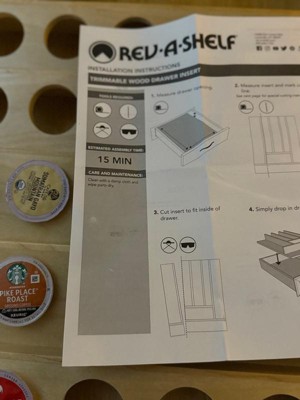 [This review was collected as part of a promotion.] This Rev-a-shelf is a great customizable wooden drawer insert. I was able to easily cut off a piece of the side so that it fits in our kitchen drawers perfectly. Adding all of our k-cups to save space on our counters. Love it