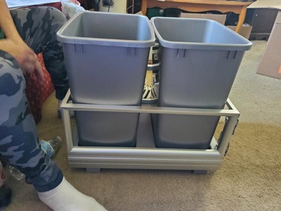 WARNING:Looking for a sturdy, attractive Pullout waste container that is perfect for any kitchen? Look no further than this American-made product. Discretely store your kitchen trash or recycling with these Rev-A-Shelf Cabinet Double Waste Containers. This Pullout trash can kit includes (2) silver 50 qt. plastic waste containers, a brushed aluminum sliding frame, and mounting hardware.