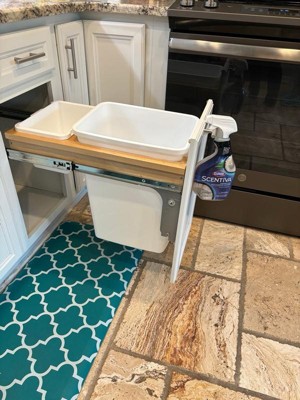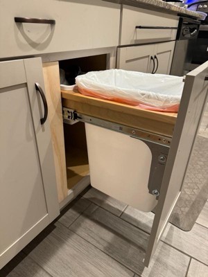 [This review was collected as part of a promotion.] I have never been a fan of an open garbage can in the middle of a kitchen, even with a lid. It is unsightly and tends to create an area for messy people to make the floor messy. We looked for under cabinet trash cans for our kitchen, but never found one that looked quite right, so we're so thankful this one was given to us. Installation was a breeze, primarily because I didn't have to do it alone. (I recommend a second a person) You'll want to make sure you have the dimensions of your cabinet correct, as these are designed to attach to your cabinet door. The wood is real wood, sturdy and the sliding mechanism is smooth. The included trash can is the standard size, so it will hold a lot of garbage!