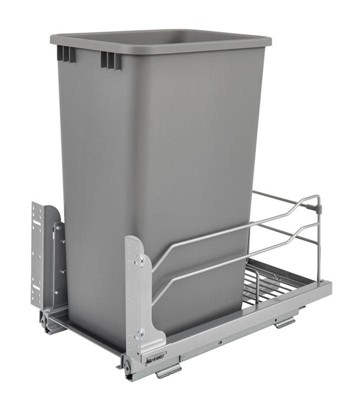 Upgrade your kitchen and get your trash off the floor and hidden in a cabinet with this Rev-A-Shelf single pullout trash container with rear storage. Designed for a cabinet opening width of 11.13 to 15 inches, this space-saving trash container comes with all the hardware you need to install this pullout trash can system. With an easy-to-install design for a no-fuss setup, this system includes (1) silver 50 qt. waste container with mounting hardware. The rear storage of this system is perfect for storing trash bags or other cleaning supplies. Effortlessly pull the trash can completely out of the cabinet on the undermount full extension slide system. The slide system, concealed to protect the slides from any trash or debris, also features soft-close technology ensuring that your cabinet won’t slam shut to keep fingers safe and cabinets from becoming worn out. Double check your cabinet's opening (inside dimensions) to allow the best fit. Measure side to side (width), front to back (depth or length), and top to bottom (height). Double check to make sure your product is within measurements and don't forget to take into account any obstructions (plumbing, hinges, etc.). Enjoy a spacious, functional kitchen, thanks to this Rev-A-Shelf Pullout Trash Bin.