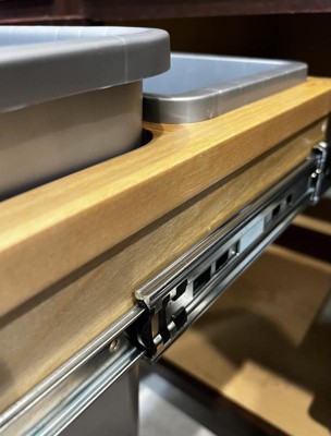 - Wood top mount pullout single waste container with ball-bearing soft-close to maximize kitchen space and keep your trash and recycling hidden yet easily accessible