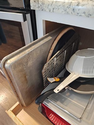 [This review was collected as part of a promotion.] I got this to help deal with a major lack of space in our family home. Finally, I can organize the cookie sheets and other baking items. It was easy to attach to the bottom of the cabinet and is very sturdy. I’m very happy I got this to help organize the kitchen.