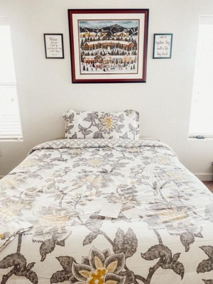 The Reverie Comforter Set by Levtex Home is traditional, delicate. Offered in yelow, grey and white, this design will immediately transform your bedroom. Made with a soft, luxurious cotton, this comforter set features a sophisticated grey, white, and yellow floral. It has a yelow, grey and white on the front and a yellow, grey, and white geometric pattern on the reverse. It is filled with a hypoallergenic 100% polyester filler. The Reverie Comforter Set is machine washable and includes the comforter and pillow case(26 x 20in.) Enjoy this for years to come!