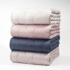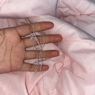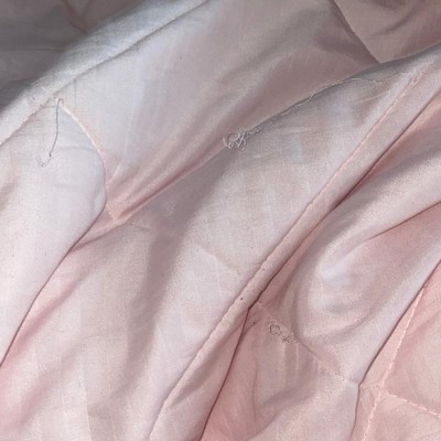 I was totally in love with this blanket when I first put it on my bed. I like the weight, looks really great (especially for the price!), and kept me much warmer than I would have expected from a blanket of this weight. However, within a couple of weeks the stuffing started coming out. There is no damage to the blanket, and it hasn’t been washed. I just noticed that the “poly fill” started poking out from the top of the blanket. At first I just snipped the pieces off, but it just got way out of hand. I’m really unhappy with this purchase. If it were for a guest room or something that’s not used daily, I would probably go ahead and buy it. But for everyday use, I highly suggest to steer clear of this one. Also, the bottom side feels really nice, but the top (“shiny”) side is awful. I keep my skin moisturized, but if my hands run across the top of this blanket, it feels really rough. Makes it feel like my skin is dry. My son felt and said the same thing. I’m glad I got it on sale, but still feel that I wasted the money because it’s not something I can continue to use. Target can do better than this for sure!