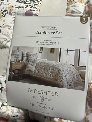 Give your sleeping nook a chic upgrade with this Reversible Floral and Stripe Comforter Set from Threshold™ designed with Studio McGee. Made from midweight cotton with polyester filling, this multi-piece bedding set includes a comforter and pillow shams boasting a reversible design for versatile use. One side showcases a seamless floral pattern in vibrant colors, while the other features a classic green-and-white striped design. The comforter is filled with soft padding, and a convenient 6-inch envelope closure on the shams allows for secure pillow placement and easy removal.