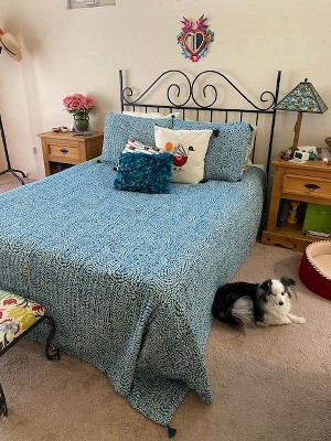 Beautiful unique colors and pattern. Very chic. Fits me when bed well. Brightens up my dreary bedroom. Pretty blue and green colors. Light and airy will be a great sometime blanket. Love this one definitely recommend.