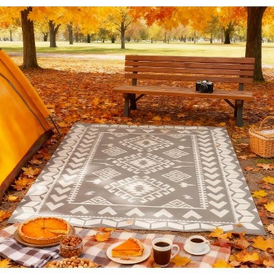 A reversible outdoor rug sized approximately 12x9ft, made from polypropylene with UV-protective coating. Features include double-sided designs, easy cleaning with rinsing or wiping, foldable portability with carry bag, and corner straps for wind resistance. Perfect for patios, picnics, or camping.