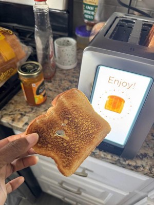 [This review was collected as part of a promotion.] WOW! This toaster is so fancy, there are so many settings on what you’re toasting. Many options of how toasted you like them. It automatically lowers and rises. The face can display pictures, the time and weather. It will also tell you when it’s time to clean it. I didn’t know I could be obsessed with a toaster but here we are.