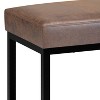 Hand constructed using wood, metal, high density foamUpholstered with a durable Distressed Chestnut Brown Vegan Faux LeatherFeatures powder coated matte black metal frame and base and comfortable cushioned seatMulti-functional ottoman can be used in bedroom, living room, family room, hallway as an entryway bench, foot stool, accent furniture or provide additional sittingContemporary designAssembly RequiredDimensions: 14.5in d x 26in w x 18.5in hEfforts are made to reproduce accurate colors, variations in color may occur due to computer monitor and photography