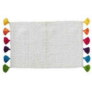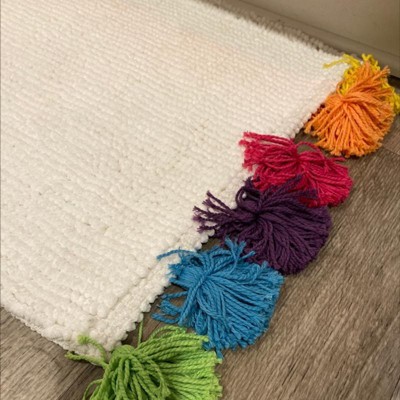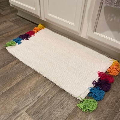 Add a bold statement to the bath décor with the Rhapsody bathroom rug by SKL Home. Featuring vibrant multicolored tassels on a white popcorn weave rug, the Rhapsody bath rug will add color to refresh and brighten your bathroom. Rug dimensions do not include the tassels. Tassels are an additional 2.5".