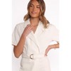 This versatile piece combines structure and style with its sharp collar, notch lapels, and a flattering V neckline. The wrap-front design, secured with a press stud closure, creates a tailored silhouette, while the front fly zip and contrast stitching add a modern edge.