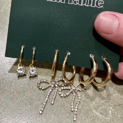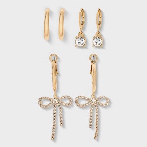 Three-pair rhinestone earring set from Wild Fable™ in gold finish. Includes three pairs with different designs — one pair of simple open hoops, one hoop pair with rhinestone-studded charms and one hoop pair with trailing bow charms embellished with sparkly rhinestones. Clip-in clasp and post-back closures offer a stay-put fit. Nickel-free metal construction makes them suitable for most skin types.