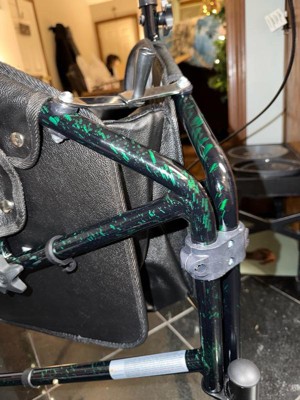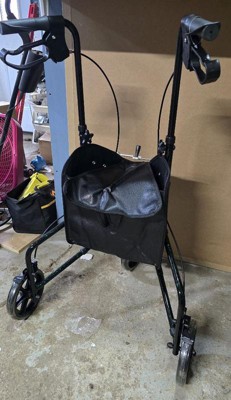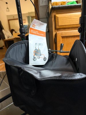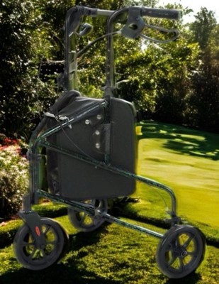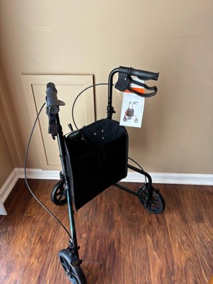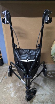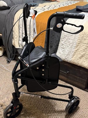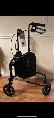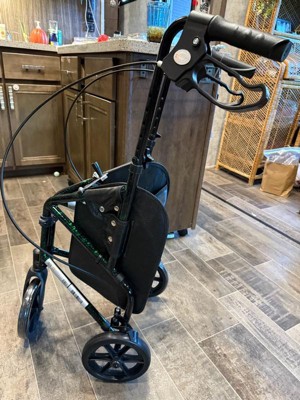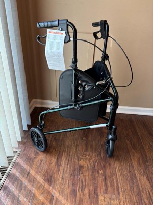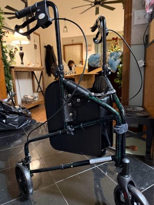 [This review was collected as part of a promotion.] This Rythem Healthcare Rally Lite Aluminum 3 Wheel Folding Walker is really handy. First off it was easy to put together. Simply put the handle rods into the desired height and secure with screw knobs. Next pull the back wheel rods out until they lock in place. Affix the brake cord into the clip to secure in place out of the way. That's it and it was easy to use. It easily folds back to a small size to store or travel with. It is very sturdy and solid. No tipping to lose your balance with. It came with an attached large pouch for carrying things. The hand brakes are easy to clinch, work great and definitely stop the wheels from moving. The green and black design is pretty. A really nice walker to travel with as its so lightweight.