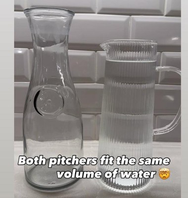 This is such a cute pitcher! I love any kitchen items that are ribbed glass they really give an elevated look. I do think this pitcher is on the smaller/slimmer side compared to other glass pitchers out there. I have intentions of using this as a flower vase, and or for hosting purposes. Threshold also makes a matching nesting bowl set and cake stand that are to die for!
