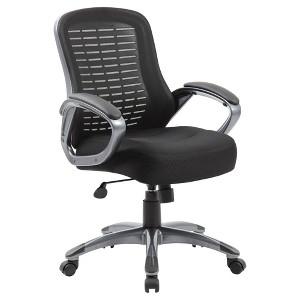 Our ergonomic mesh back task chair combines elegance and efficiency for optimal performance. It features a comfortable 4” padded mesh seat, an upright locking position, adjustable tilt tension control, pneumatic gas lift seat height adjustment, and padded loop arms covered with Black CarressoftPlus. The back is comprised of ribbed mesh and is appropriately curved for optimal lumbar support. The 27” base has a gun metal finish with black caps and rests atop five hooded double wheel casters.