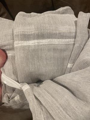 This semi-sheer rod pocket with back tabs single curtain panel is a beautiful, slightly delicate, loosely woven faux linen semi-sheer panel with a raised horizontal chenille yarn striped that repeats through the body of the curtain every 8". This lovely, light-filtering fabric adds a casual, flowing, yet elegant texture to any room. This 55" wide curtain panel has an airy feel and compliments any room decor. These panels are available in multiple lengths 63", 84" and 96". This superior fabric is 100% easy-care polyester. Machine washable and line dry. Imported. Available in three colors: White/White, Grey/White and Natural/White WOVEN FABRIC: This unique fabric is both casual and elegant, creating a warm natural look and feel in any space. This gorgeous fabric has an open weave that hangs beautifully.