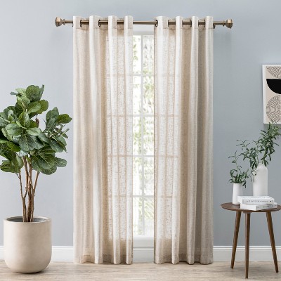 This textured single panel woven linen blend Swadlincote lined grommet brings a soothing casual quality to any room. The fabric is loosely woven with slub yarns, which creates a warm and natural effect. The rich lining behind the light filtering fabric adds fullness and creates privacy so that the woven fabric hangs over the quality lining gracefully and makes a perfect dressing for any window. This 52" wide panel features 8 metal grommets measuring 1.5" inside diameter. Brush nickel grommet finish for colors white and grey. Antique bronze grommet finish for colors Natural and Toffee. To hang, use a decorative rod with matching grommet finish with a diameter of up to 1.25". Available in both 63" and 84" length as well as patio width LINED - WOVEN TEXTURED LINEN-BLEND FABRIC: This loosely woven textured fabric is both casual and elegant, creating a warm look and feel in any space. The rich brushed fabric lining creates the perfect amount of light filtration maintaining some privacy, while allowing the curtain to hang gracefully and beautifully in any room