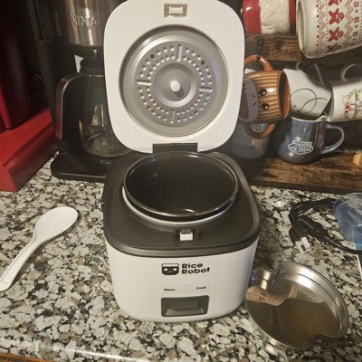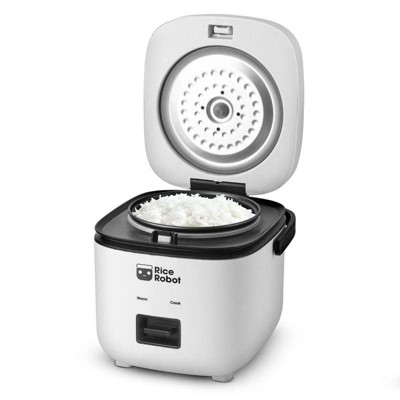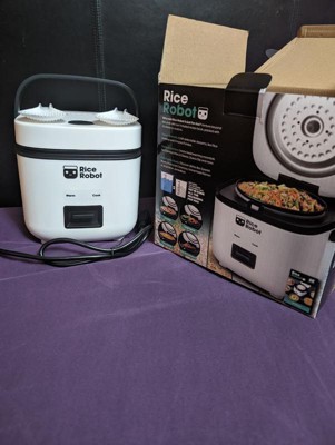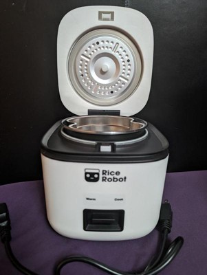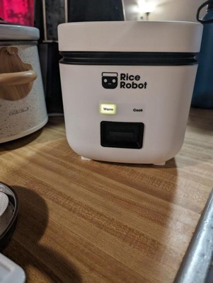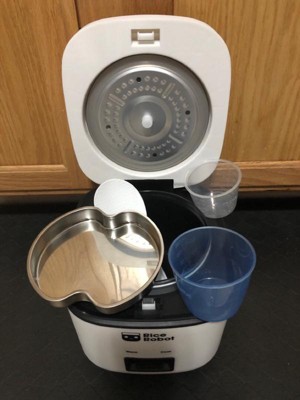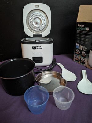 - Rice Robot Rice Cooker: Includes a small rice cooker that makes up to 4.5 cups cooked, a 1.2-quart nonstick ceramic inner pot, steamer insert, water measuring cup, rice measuring cup, serving spoon, and a recipe book.