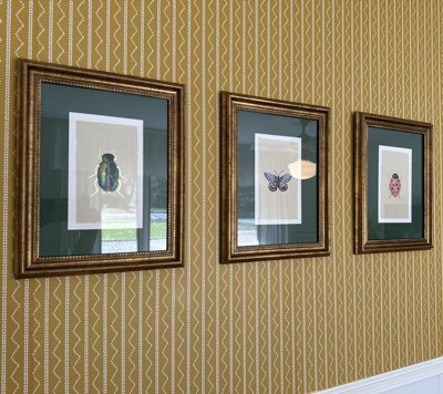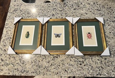 Nice set of framed insect art with pretty gold foil detail. I knew I would purchase them based on the beautiful contrast between the green matting and gold frames. They look great with the other art in our spare room.