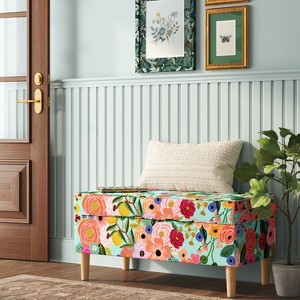 This Storage Bench from Rifle Paper Co. x Target will bring unique form and function to your home decor. This rectangular storage bench features a wood frame, light-tone wood legs and beautiful floral upholstery. The padded top covered in soft fabric is great for sitting, and the distinctive style makes for charming storage in your space.