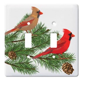 This double toggle switch plate cover features a Cardinal pair on pine boughs.