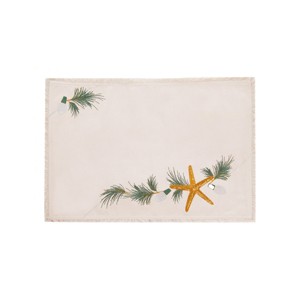 Set of four natural cotton placemats are embroidered with starfish and pine boughs, accented with shimmery gold and sage green threads. Featuring casual fringed edges, these can be machine washed and air dried. Cool iron.