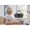The CDB490BT Riptunes Stereo Boombox lets you play traditional and MP3 CDs, or AM/FM radio in full stereo sound. With built-in Bluetooth technology, this Riptunes Boombox allows you to wirelessly stream music from your external Bluetooth devices. A top-loading CD player enables you to play back CD /MP3 disc media. Digital AM/FM Radio tuner with 20 station preset memory for Radio programming The USB Playback & SD playback Multimedia Player plays your digital files from your USB and SD devices easily. The auxiliary audio input (3. 5mm) allows you to enjoy music from other devices thru a 3.5mm Cable and the folding carry handle makes it easy to move the unit from room to room or even to the outdoors in nice weather.