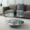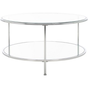 Modern style takes center stage with this sleek two-tier coffee table. A round glass tabletop neatly displays decor, while a mirrored shelf tucks away your favorite books. Slide this contemporary coffee table into your living room for a glam-inspired look, or add to your open concept space for a unique blend of function and style. Give your home design a modern upgrade with this glass-top coffee table.