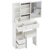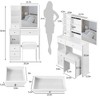 This compact modern makeup vanity desk comes complete with both the dressing table and a cushioned stool, ensuring convenience and comfort. The matching stool perfectly complements the vanity, eliminating the need for separate purchases and saving time and money on additional deliveries. A practical and chic addition to any bedroom, this vanity set offers functionality and style in one package.This vanity desk with mirror features numerous drawers and open shelves, providing plenty of room for storing makeup, beauty tools, skincare products, and accessories. The spacious compartments are ideal for keeping items well-organized and easily accessible. The open shelves allow for quick retrieval of frequently used items, ensuring a tidy and efficient storage solution. Perfect for creating a clutter-free and well-ordered space.