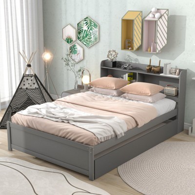 RISOKEYS Full Size Kids Bed Frame with Storage Bookcase, Adjustable Bed Guardrails & Easy Assembly - Low-Height Solid Wood Bed for Boys/Girls - 1 of 4