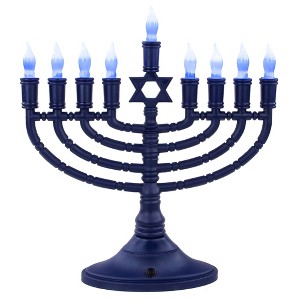 This electric Menorah is perfect for Eco-Conscious consumers! Featuring elegant 2 tone blue and white glass LED bulbs perfect for public display. Includes sequential lighting and extra effects such as flashing, blinking, and chasing light features.