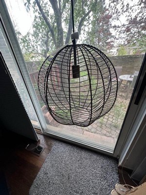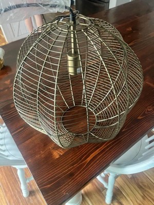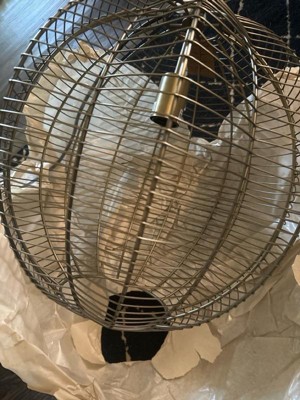 - Round, globe-shaped shade wrapped in brass-finish wire