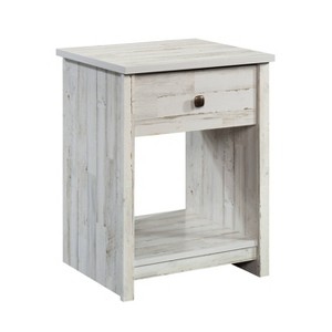 For the perfect place to set your glass of water at bedtime, look no further than the country chic design of the River Ranch™ nightstand. This nightstand with drawer features a storage drawer with metal runners and safety stops to hold your bedside essentials like the TV remote, your favorite book, your jewelry box, and more. The lower open shelf of this rustic nightstand provides ample amount of room for an organizing bin, home décor, or stack of books. Use the spacious top surface of this nightstand with open storage to set your nighttime tea, your alarm clock, reading glasses, and your phone. Charge your cellular device overnight with ease because this bedside table with drawer accommodates optional Hidden Wireless Qi Compatible Charger by Eggtronics 425905 (sold separately – visit sauder.com for more information). Finished on all sides for versatile placement, this farmhouse nightstand will look polished from every angle. Assembly is a breeze with the T-slot drawer system and slide-on moldings. Finished in a White Plank®, this nightstand finally fives you somewhere, other than the floor, to put your bedtime necessities.