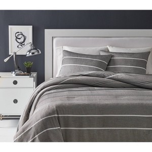 This charcoal stripe woven jacquard adds sophistication and style to any bedroom. The gray and charcoal tones lend itself to any décor. The 3 piece set comes with two matching shams.
