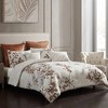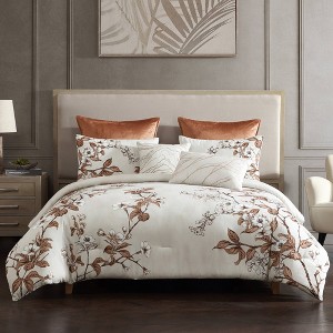 Rest easy with this warm spice colored printed floral comforter set. Printed on textured polyester, you can almost smell the flowers as they cascade down the face of the mid-weight comforter. The abstract embroideries on the decorative pillows completement the set. Comes complete with matching pillow shams. Euro shams sold separately. Machine Washable. Imported.