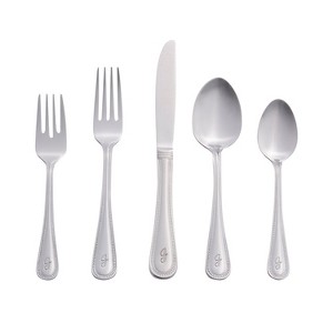 Our RiverRidge® Beaded Stainless Steel Flatware Collection features a classic and versatile design with elegant beaded detailing that coordinates with any table setting. Our 46-piece flatware set with service for 8 and a 6-piece serving set is ideal for daily use and special occasions. Crafted from heavy gauge stainless steel, each piece has a polished mirror finish and is dishwasher-safe, ensuring lasting durability and easy cleaning. Available in non-monogrammed and personalized with a letter, our cutlery set adds a unique touch to every meal.