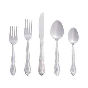 This RiverRidge Rose 46 piece flatware set brings elegance to your table. Each piece is permanently stamped with your chosen letter, adding a personal touch to every meal. This set includes 8 place settings and 6 serving pieces, perfect for family meals and gatherings. The set includes 8 of each dinner forks, spoons, salad forks, teaspoons, and knives, plus a one serving spoon, slotted spoon, gravy ladle, serving fork, butter knife, and sugar spoon. It's dishwasher-safe for easy cleaning. Our Rose Flatware Set offers versatility for all your dining needs. Crafted from durable heavy gauge 18/0 stainless steel, each piece features a polished mirror finish that resists tarnishing. The traditional shape and delicate rose blossom design create a timeless look that suits various table settings. Ideal for both everyday use and special occasions, our flatware set is a versatile choice for newlyweds or new homeowners.